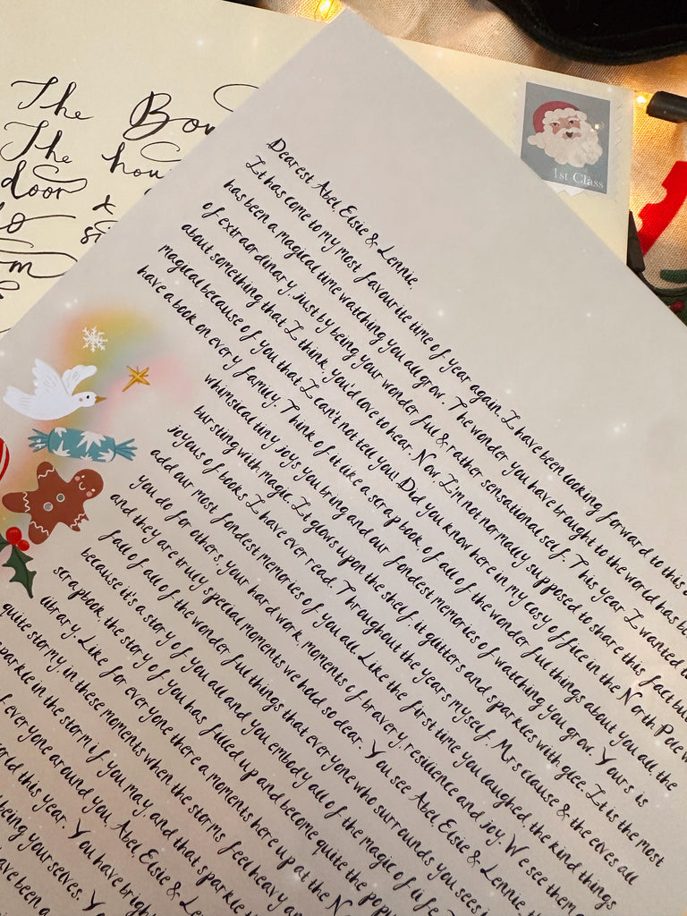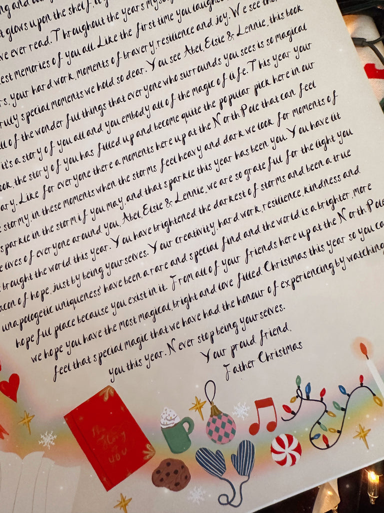 It has come to my most favourite time of year again. I have been looking forward to this day all year long. It has been a magical time watching you all grow . The wonder you have brought to the world has been nothing short of extraordinary, just by being your wonderful & rather sensational self. This year I wanted to tell you about something that I think you’d love to hear. Now, I’m not normally supposed to share this fact, but it’s so magical because of you that I can’t not tell you! Did you know, here in my cosy office in the North Pole, we have a book on every family. Think of it like a scrapbook of all of the wonderful things about you all, the whimsical, tiny joys you bring, and our fondest memories of watching you grow. Yours is bursting with magic. It glows upon the shelf, it glitters and sparkles with glee. It is the most joyous of books I have ever read. Throughout the years myself, Mrs clause & the elves, all add our most fondest memories of you all. Like the first time you laughed, the kind things you do for others, your hard work, moments of bravery, resilience, and joy. We see them all, and they are truly special moments we hold so dear. You see, __________, this book is full of all of the wonderful things that everyone who surrounds you sees is so magical because it’s a story of you all, and you embody all of the magic of life. This year, your scrapbook, the story of you, has filled up and become quite the popular pick here in our library. Like for everyone, there are moments here up at the North Pole that can feel quite stormy, in these moments when the storms feel heavy and dark, we look for moments of joy, a sparkle in the storm, if you may, and that sparkle this year has been you. You have lit up the lives of everyone around you, _____________. We are so grateful for the light you have brought to the world this year. You have brightened the darkest of storms and been a true beacon of hope, just by being yourselves. Your creativity, hard work, resilience, kindness, and unapologetic uniqueness have been a rare and special find, and the world is a brighter, more hopeful place because you exist in it. From all of your friends here up at the North Pole, we hope you have the most magical, bright, and love filled Christmas this year so you can feel that special magic that we have had the honour of experiencing by watching over you this year. Never stop being yourselves.