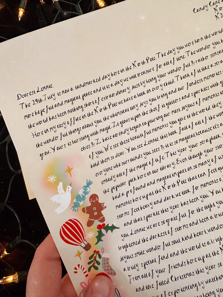 __________ is now a landmarked day here in the North Pole. The day you were born, the world became a more hopeful and magical place, and it is a day we will treasure for all of time. The wonder you have brought to the world has been nothing short of extraordinary, just by being your wonderful & rather sensational little self. Here in my cosy office in the North Pole, we have a book for every child. Think of it like a scrapbook of all of the wonderful things about you, the whimsical, tiny joys you bring, and our fondest memories of watching you grow. Yours is bursting with magic. It glows upon the shelf, it glitters and sparkles with glee. Mrs Claus, the elves & I have already begun capturing our most joyous of moments in our treasured story of you. We see these beautiful moments you give to the world, they are truly special & we hold them so dear. You see, __________, this book full of all of the wonderful things that everyone who surrounds you sees & it is so magical because it’s a story of you and you embody all of the magic of life. This year, your scrapbook, the story of you become quite the popular pick here in our library. Even though your story is just beginning, it has already had a profound and magical impact on so many of us. Like for everyone, there are moments here up at the North Pole that can feel quite stormy, in these moments when the storms feel heavy and dark, we look for moments of joy, a sparkle in the storm, if you may, and that sparkle this year has been you. You have lit up the lives of everyone around you, __________, we are so grateful for the light you have brought the world this year. You have brightened the darkest of storms and been a true beacon of hope, just by being you. Your joyous smile, wonderful soul, kind heart, wondrous eyes and your rare, kindred spirit have been a truly special find and the world is a brighter, more hopeful place because you exist in it.