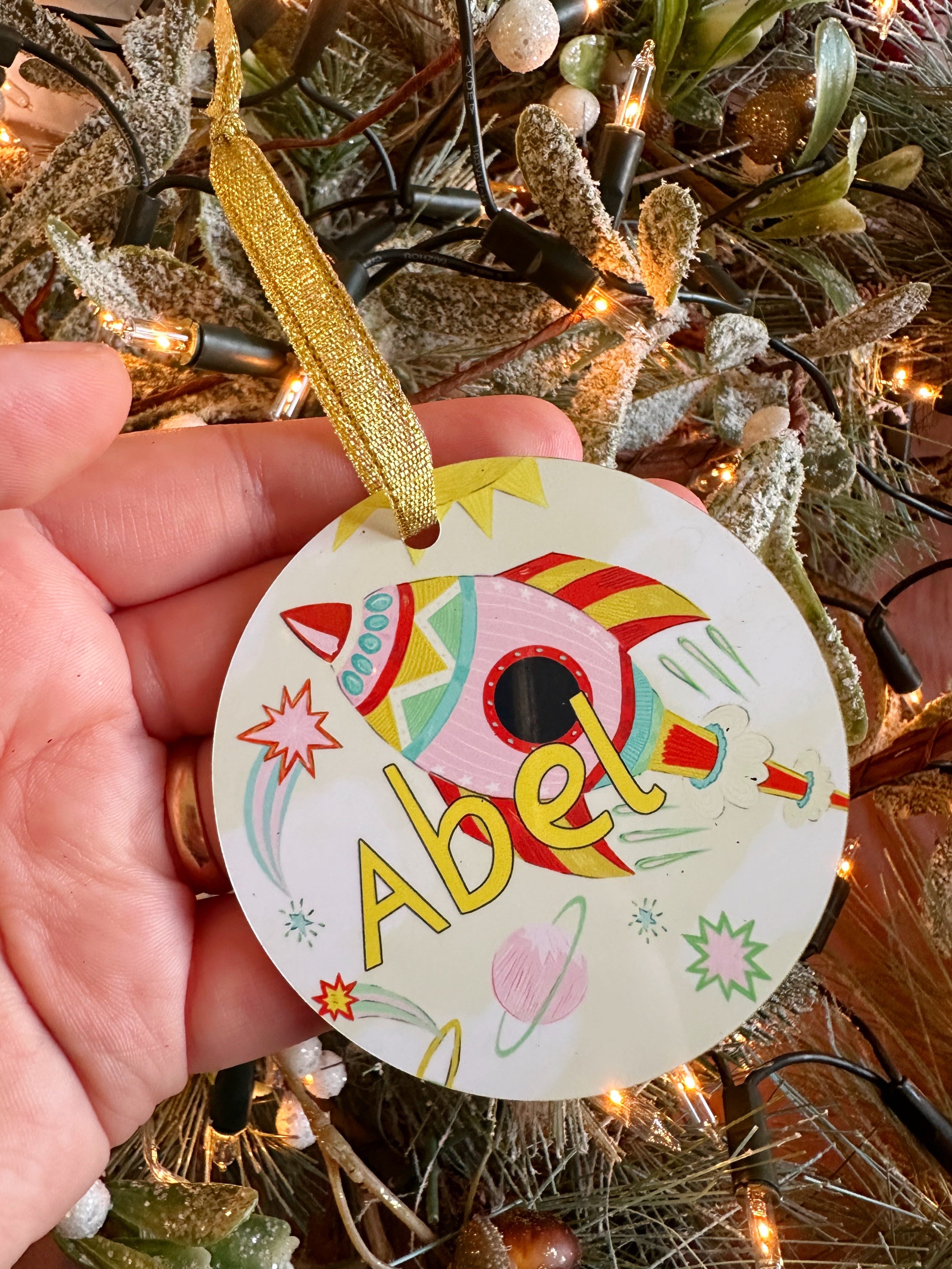 Personalised Christmas Wish Circus Rocket Double-sided Aluminium Wipe Clean Christmas Tree Decoration