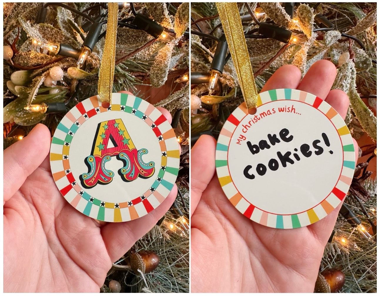 Each decoration is made to order and is printed in-house by us onto aluminium. Each decoration is double-sided and is 7.5cm in circumference and comes ready to hang.